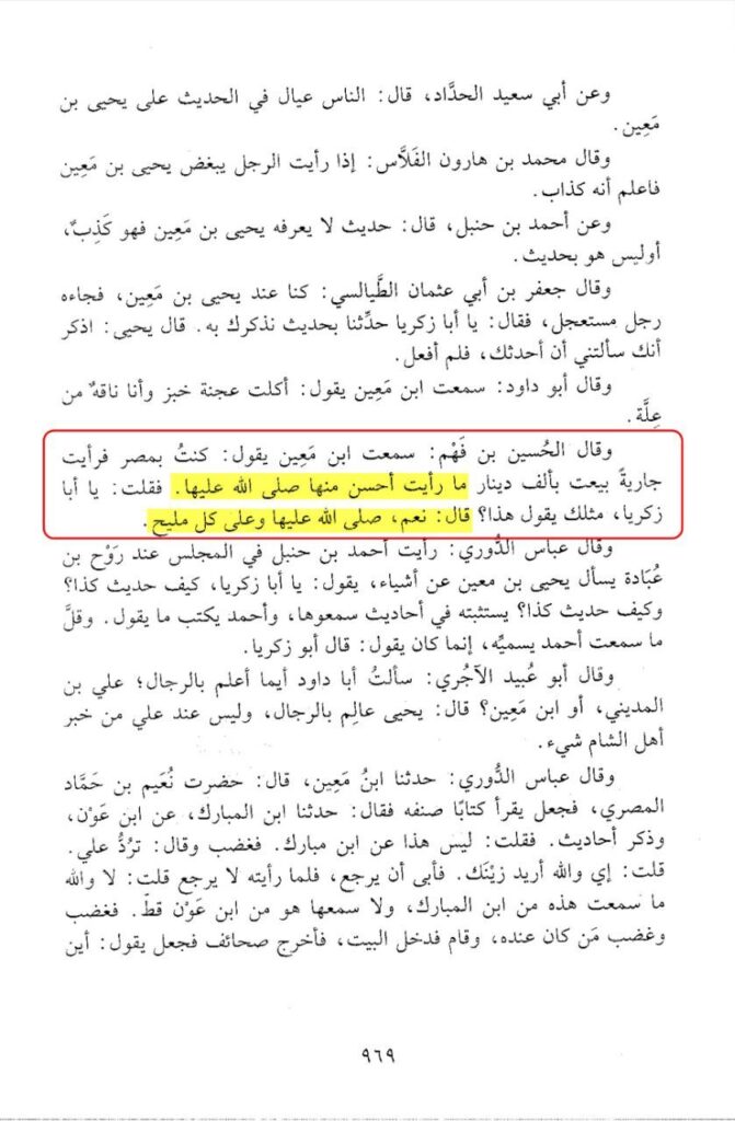 وَقالَ الحُسَيْنُ بْنُ فَهْمٍ: سَمِعْتُ ابْنَ مَعِينٍ يَقُولُ: كُنْتُ بِمِصْرَ فَرَأَيْتُ جارِيَةً بِيْعَتْ بِأَلْفِ دِينَارٍ ما رَأَيْتُ أَحْسَنَ مِنْها صَلَّى اللهُ عَلَيْها. فَقُلْتُ: يا أبا زَكَرِيَّا مِثْلُكَ يَقُولُ هذا؟ قالَ: نَعَمْ، صَلَّى اللهُ عَلَيْها وَعَلى كُلِّ مَلِيحٍ.