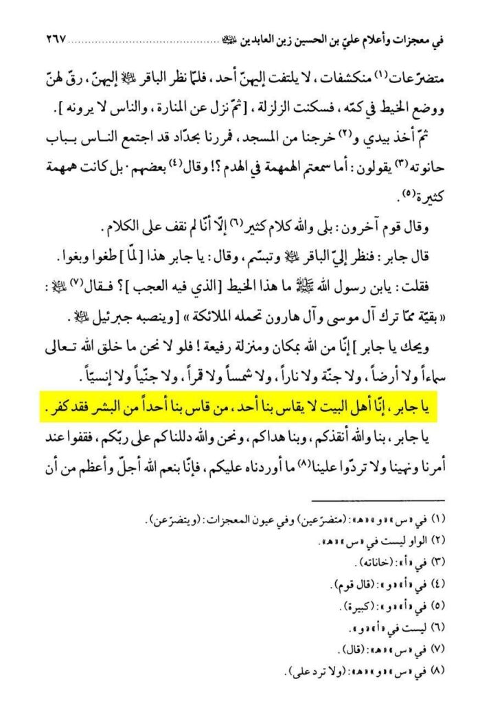 اے جابر! بے شک ہم اہلِ بیتؑ ایسے ہیں کہ ہم سے کسی کو قیاس نہیں کیا جا سکتا، پس جو شخص کسی انسان کو ہم اہلِ بیتؑ کے ساتھ مقایسہ کرے اور اس عقیدے پر ہو، وہ یقیناً کافر ہو گیا۔