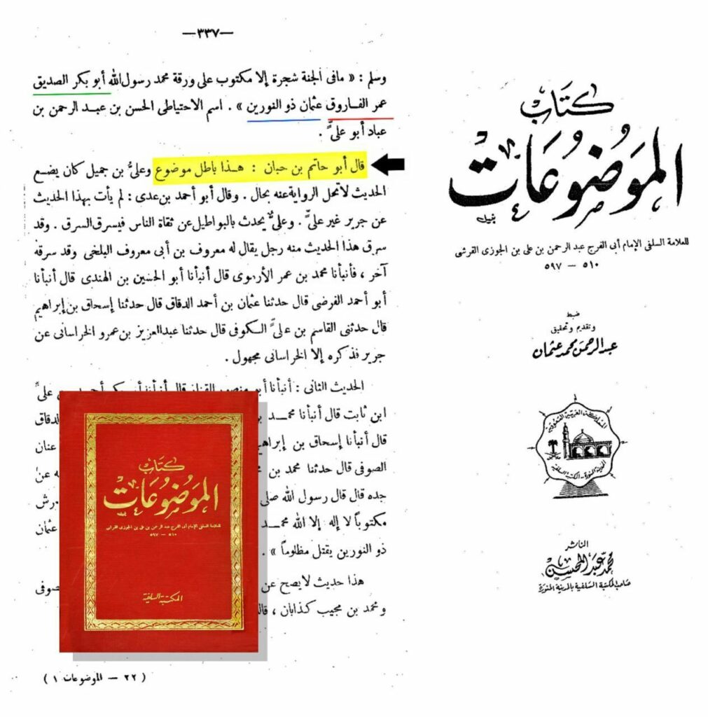 جنت کے درخت کے پتوں پر ابوبکر صدیق،عمر فاروق اور عثمان ذوالنورین لکھا ہے – حدیث موضوع "ابن جوزی”