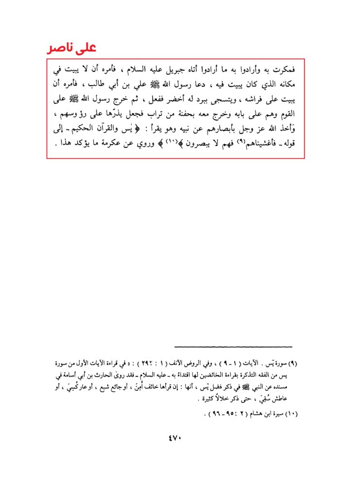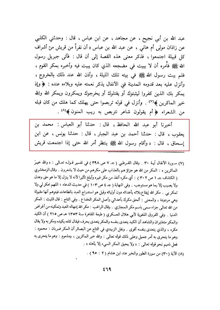 أَخْبَرَنَا أَبُو عَبْدِ اللهِ الْحَافِظُ، قَالَ: حَدَّثَنَا أَبُو الْعَبَّاسِ: مُحَمَّدُ بْنُ يَعْقُوبَ، قَالَ: حَدَّثَنَا أَحْمَدُ بْنُ عَبْدِ الْجَبَّارِ، قَالَ: حَدَّثَنَا يُونُسُ، عَنِ ابْنِ إِسْحَاقَ، قَالَ: «وَأَقَامَ رَسُولُ اللهِ صلى الله عليه وآله وَسَلَّمَ يَنْتَظِرُ أَمْرَ اللهِ حَتَّى إِذَا اجْتَمَعَتْ قُرَيْشٌ فَمَكَرَتْ بِهِ وَأَرَادُوا بِهِ مَا أَرَادُوا أَتَاهُ جِبْرِيلُ عَلَيْهِ السَّلَامُ، فَأَمَرَهُ أَنْ لَا يَبِيتَ فِي مَكَانَهُ الَّذِي كَانَ يَبِيتُ فِيهِ، دَعَا رَسُولُ اللهِ صَلَّى الله عليه وآله وَسَلَّمَ عَلِيَّ بْنَ أَبِي طَالِبٍ، فَأَمَرَهُ أَنْ يَبِيتَ عَلَى فِرَاشِهِ، وَيَتَسَجَّى بِبُرْدٍ لَهُ أَخْضَرَ فَفَعَلَ، ثُمَّ خَرَجَ رَسُولُ اللهِ صَلَّى اللهُ عَلَيْهِ وآله وَسَلَّمَ عَلَى الْقَوْمِ وَهُمْ عَلَى بَابِهِ وَخَرَجَ مَعَهُ بِحَفْنَةٍ مِنْ تُرَابٍ فَجَعَلَ يَذَرُّهَا عَلَى رؤوسهم، وَأَخَذَ اللهُ عَزَّ وَجَلَّ بِأَبْصَارِهِمْ عَنْ نَبِيِّهِ وَهُوَ يَقْرَأُ: يَس وَالْقُرْآنِ الْحَكِيمِ- إِلَى قَوْلِهِ- فَأَغْشَيْناهُمْ [ (٩) ] فَهُمْ لا يُبْصِرُونَ [ (١٠) ] وَرُوِيَ عَنْ عِكْرِمَةَ مَا يُؤَكِّدُ هٰذَا.(سیرت ابن ھشام میں)