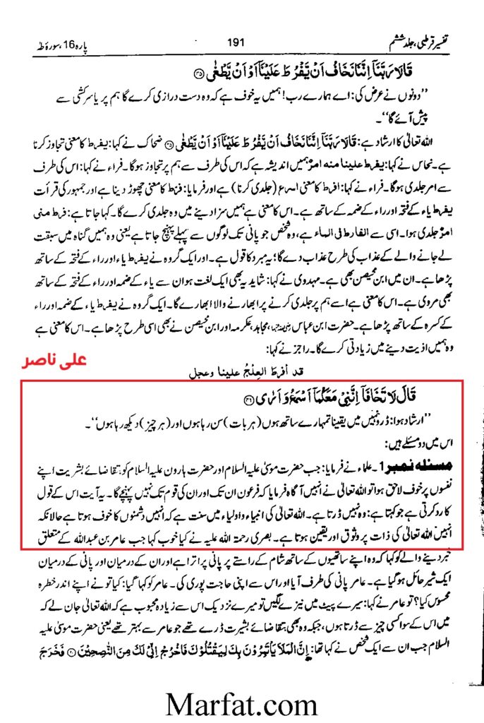 امام قرطبی نے اپنی تفسیر میں سورہ طہ کی آیت جس میں پروردار عالم نے حضرت موسی علیہ السلام اور حضرت ہارون علیہ السلام علیہ السلام سے کہا کہ مت ڈرو ،جب پروردگار عالم نے ان سے کہا تھا کہ تم دونوں فرعون کے پاس جاو وہ بہت سرکش ہو گیا ہے۔