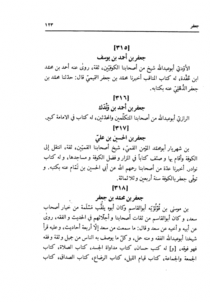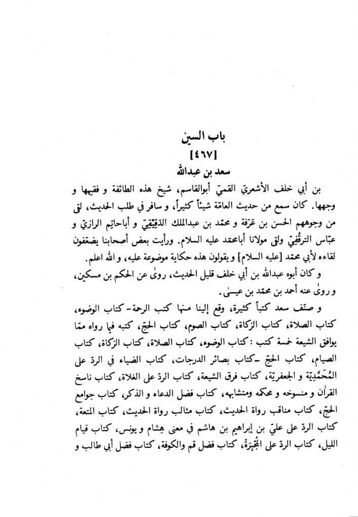 4⃣سعد بن عبد الله«467 سعد بن عبد الله بن أبي خلف الأشعري القمي أبو القاسمشيخ هذه الطائفة و فقيهها و وجهها. كان سمع من حديث العامة شيئا كثيرا، و سافر في طلب الحديث، لقي من وجوههم الحسن بن عرفة و محمد بن عبد الملك الدقيقي و أبا حاتم الرازي و … .»
