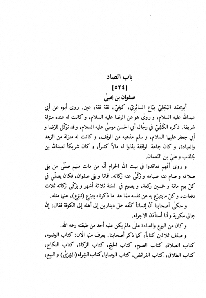 6⃣ صفوان بن یحیی البجلی؛ از اصحاب اجماع ومشایخ ثقات «524 – صفوان بن يحيى أبو محمد البجلي بياع السابريكوفي ثقة ثقة عين. روى أبوه عن أبي عبد الله عليه السلام و روى هو عن الرضا عليه السلام و كانت له عنده منزلة شريفة.»