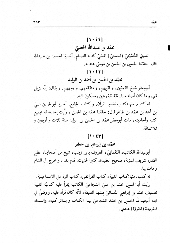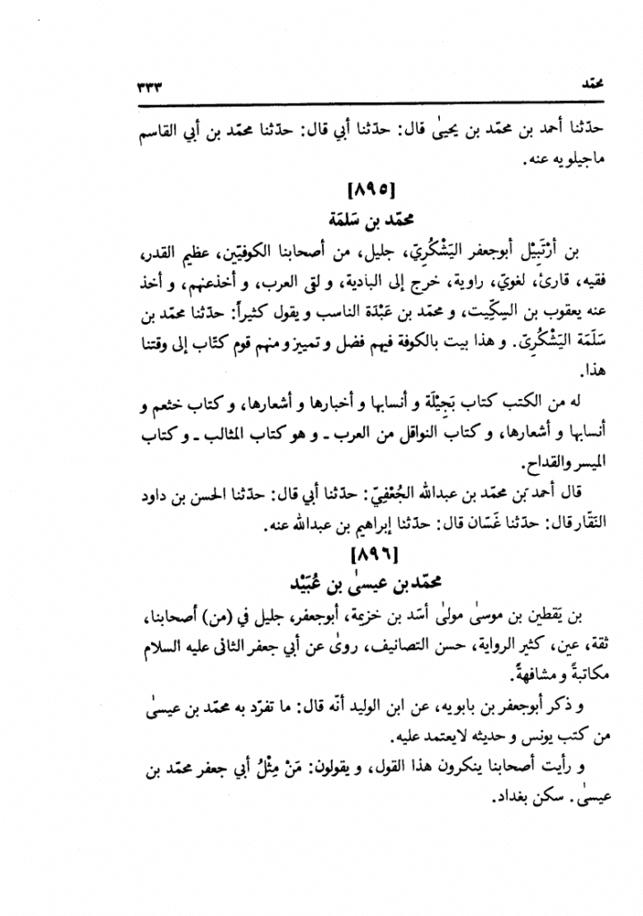5⃣محمد عيسى بن عبيد«896 – محمد بن عيسى بن عبيد بن يقطين بن موسى مولى أسد بن خزيمة أبو جعفر جليل في (من) أصحابنا ثقة عين كثير الرواية حسن التصانيف روى عن أبي جعفر الثاني عليه السلام مكاتبة و مشافهة.»