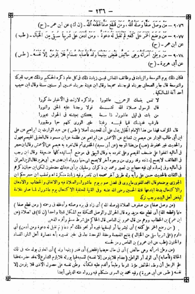 جو کچھ عاشوراء کے دن کے روزے کی فضیلت،نماز،انفاق،خضاب کرنا،بالوں میں تیل لگانا اور آنکھوں میں سرمہ لگانا وغیرہ کے بارے میں بیان کیا گیا ہے وہ سب بدعت ہے کہ جسکو امام حسین کے قاتلوں نے ذکر کیا ہے اور یہی باتیں انکی اہلبیت کے ساتھ دشمنی کی بھی علامت ہےکہ ان سب بدعتوں کو ترک کرنا واجب ہے۔