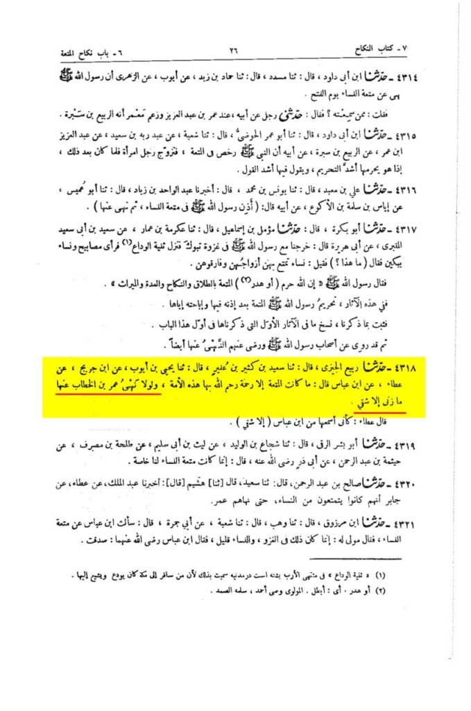 عَنِ ابْنِ عَبَّاسٍ قَالَ: مَا کَانَتِ الْمُتْعَةُ إِلَّا رَحْمَةً رَحِمَ اللهُ بِهَا هَذِهِ الْأُمَّةَ , وَلَوْلَا نَهْیُ عُمَرَ بْنِ الْخَطَّابِ عَنْهَا مَا زَنَى إِلَّا شَقِیٌّ